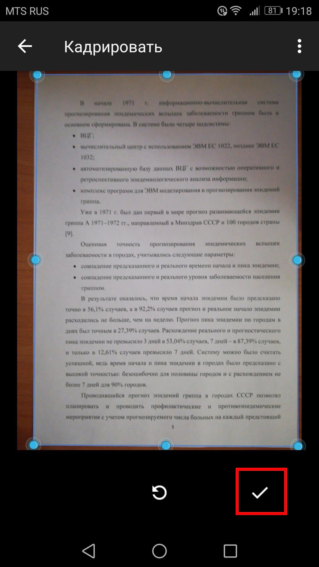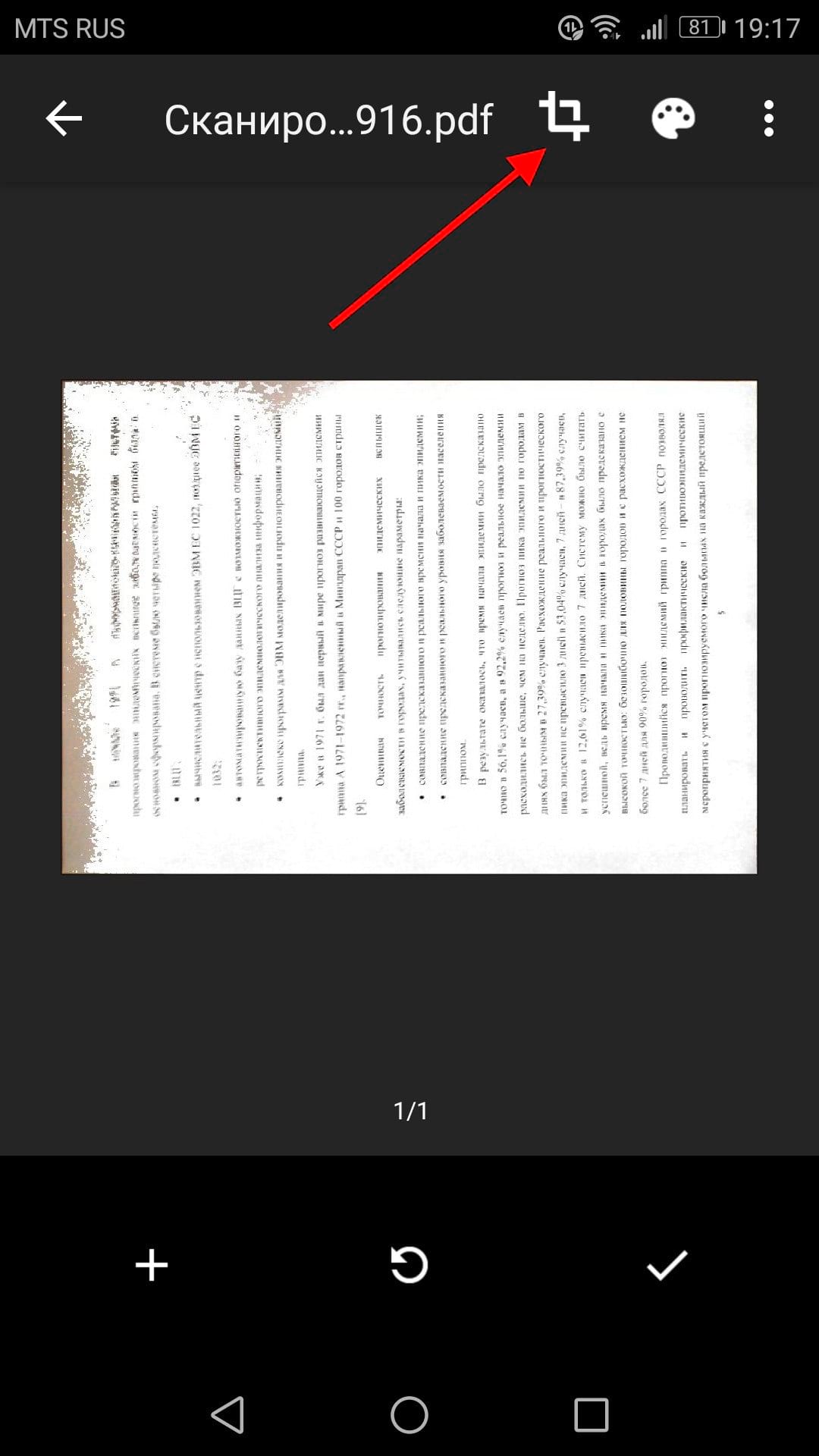 После сканирования документа сразу же появится предварительный просмотр. Не волнуйтесь, если при просмотре большая часть документа будет обрезана. Нажмите на соответствующую иконку, чтобы выбрать область, которую Вы хотите сохранить.