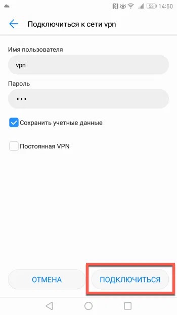 - Введите vpn в поля “Имя пользователя” и “Пароль” при первом использовании. Отметьте галочку “Сохранить учетные данные”. Нажмите кнопку , чтобы установить VPN-подключение