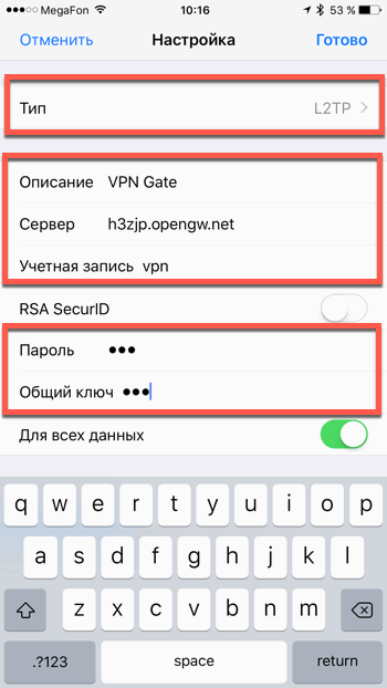 - Введите vpn в поля "Учетная запись", "Пароль" и "Общий ключ", затем нажмите "Готово".